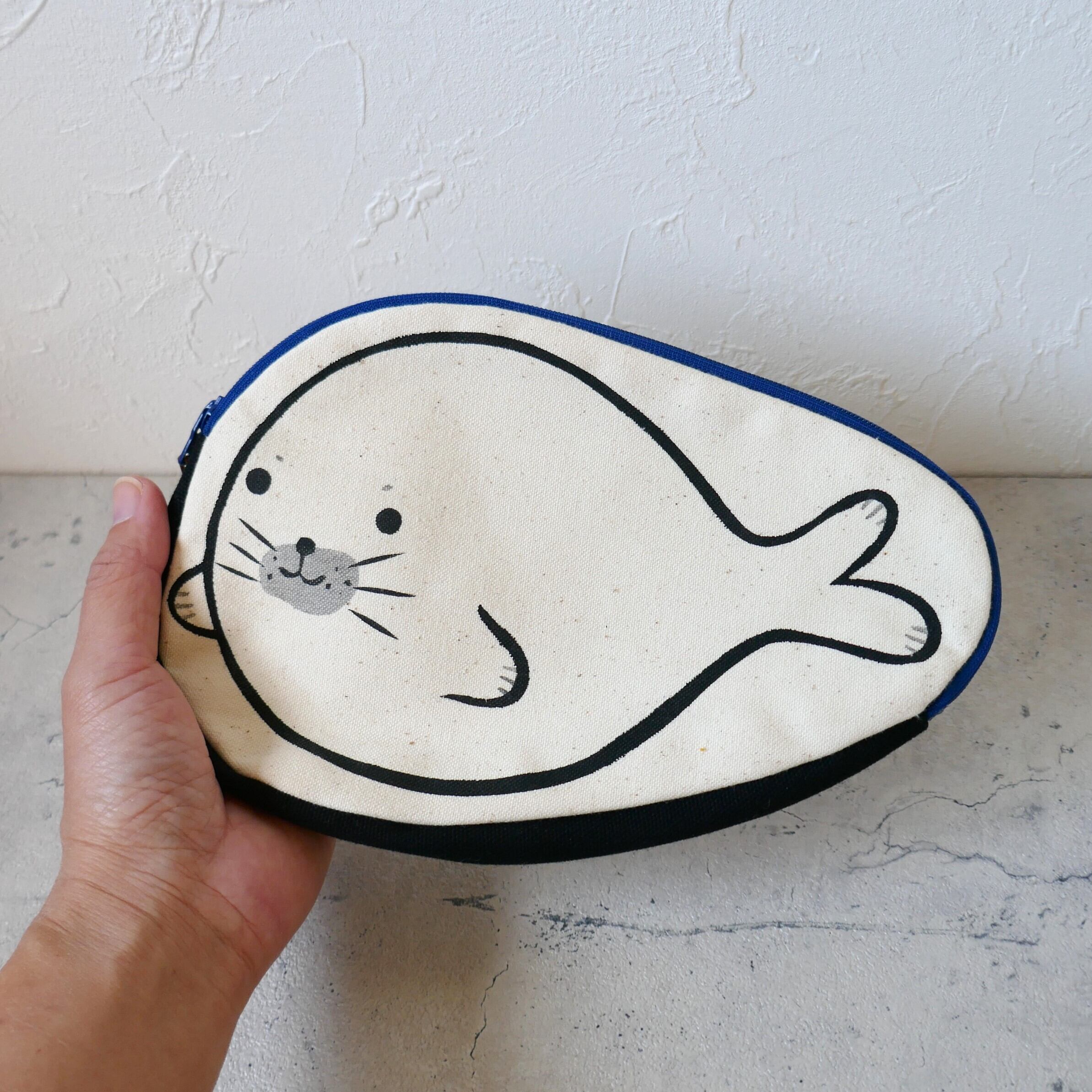帆布をシルクスクリーンで染めたアザラシ柄のマチ付きポーチです。