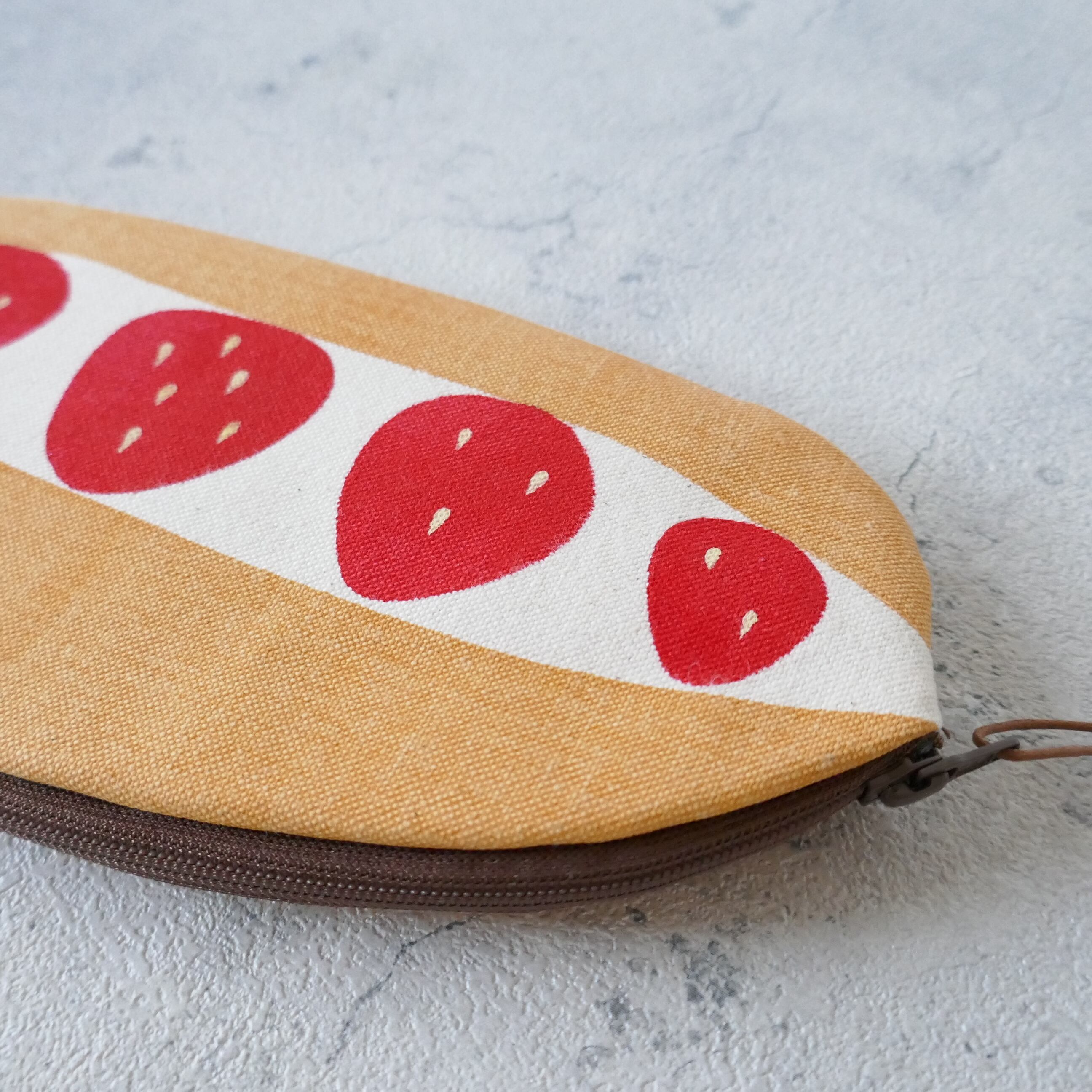 帆布をシルクスクリーンで染めたコッペパンサンド型のポーチです。