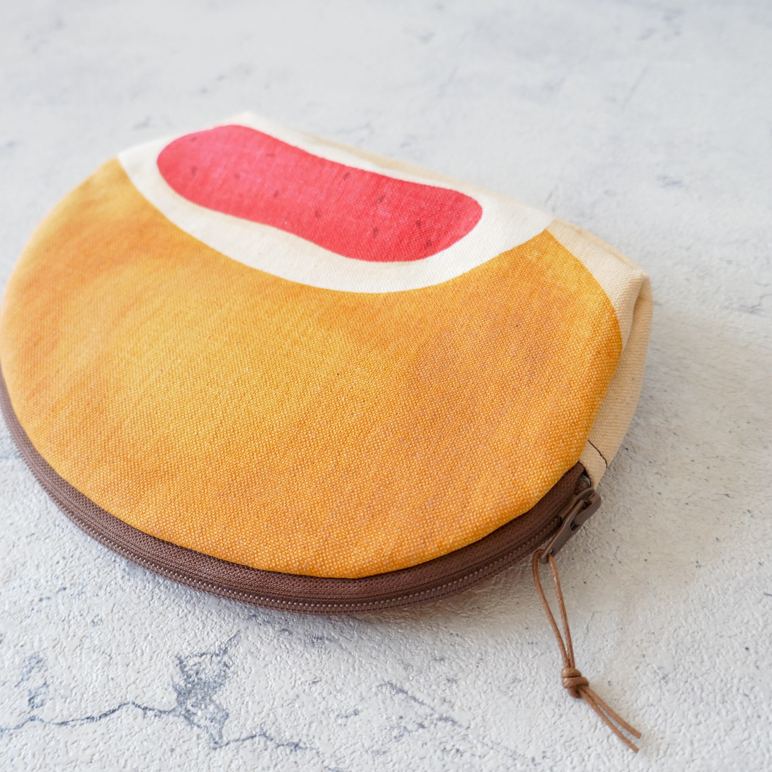 帆布をシルクスクリーンと布用絵の具で染めたジャムパン型のポーチです。