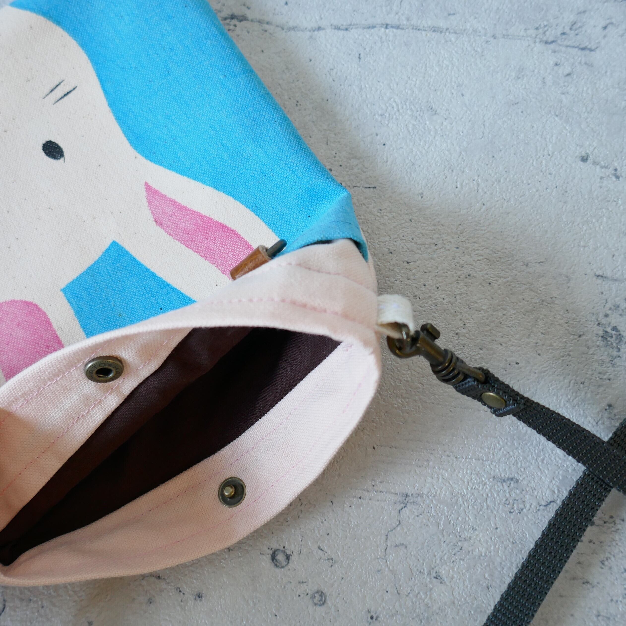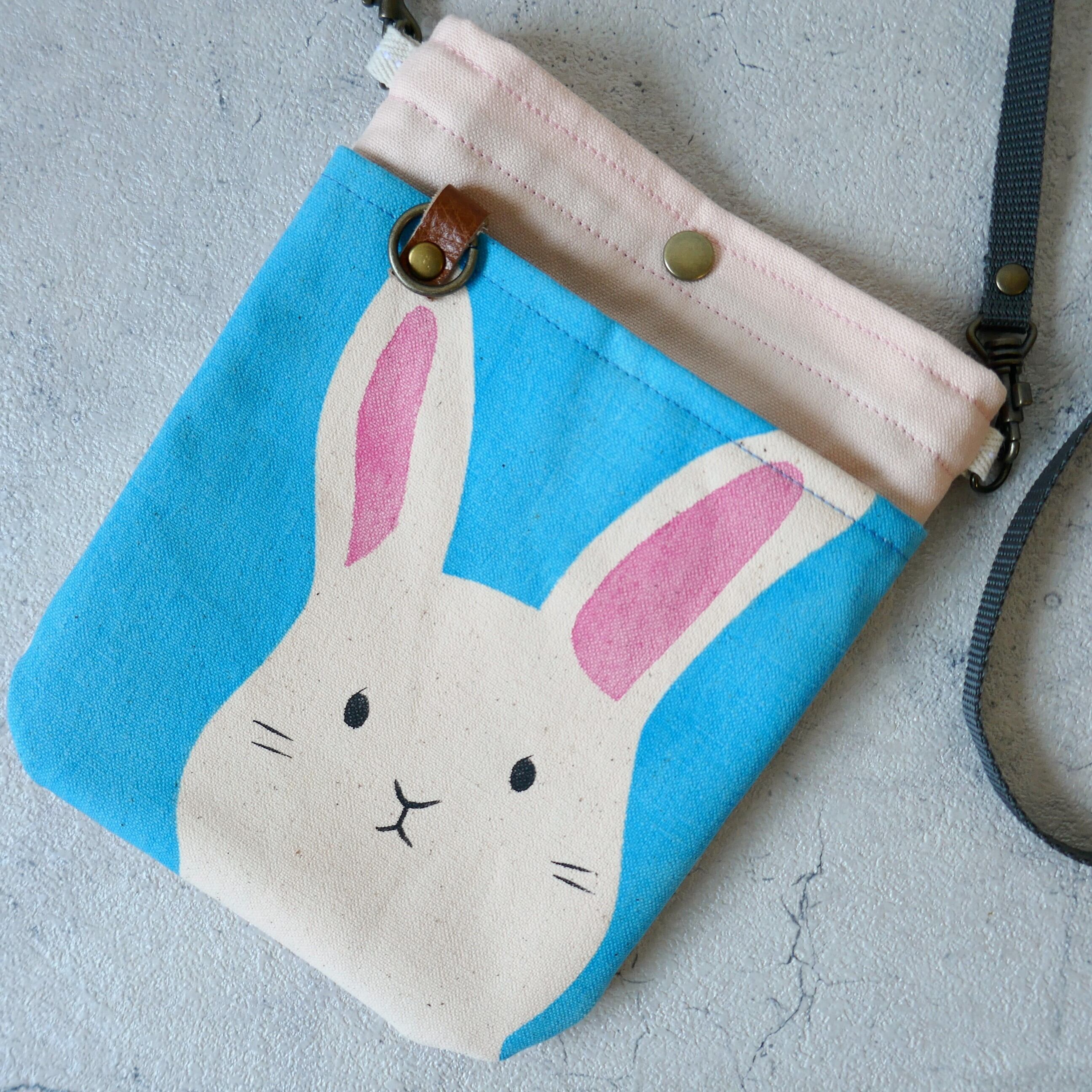 帆布をシルクスクリーンで染めたうさぎ柄のスマホポシェットです。