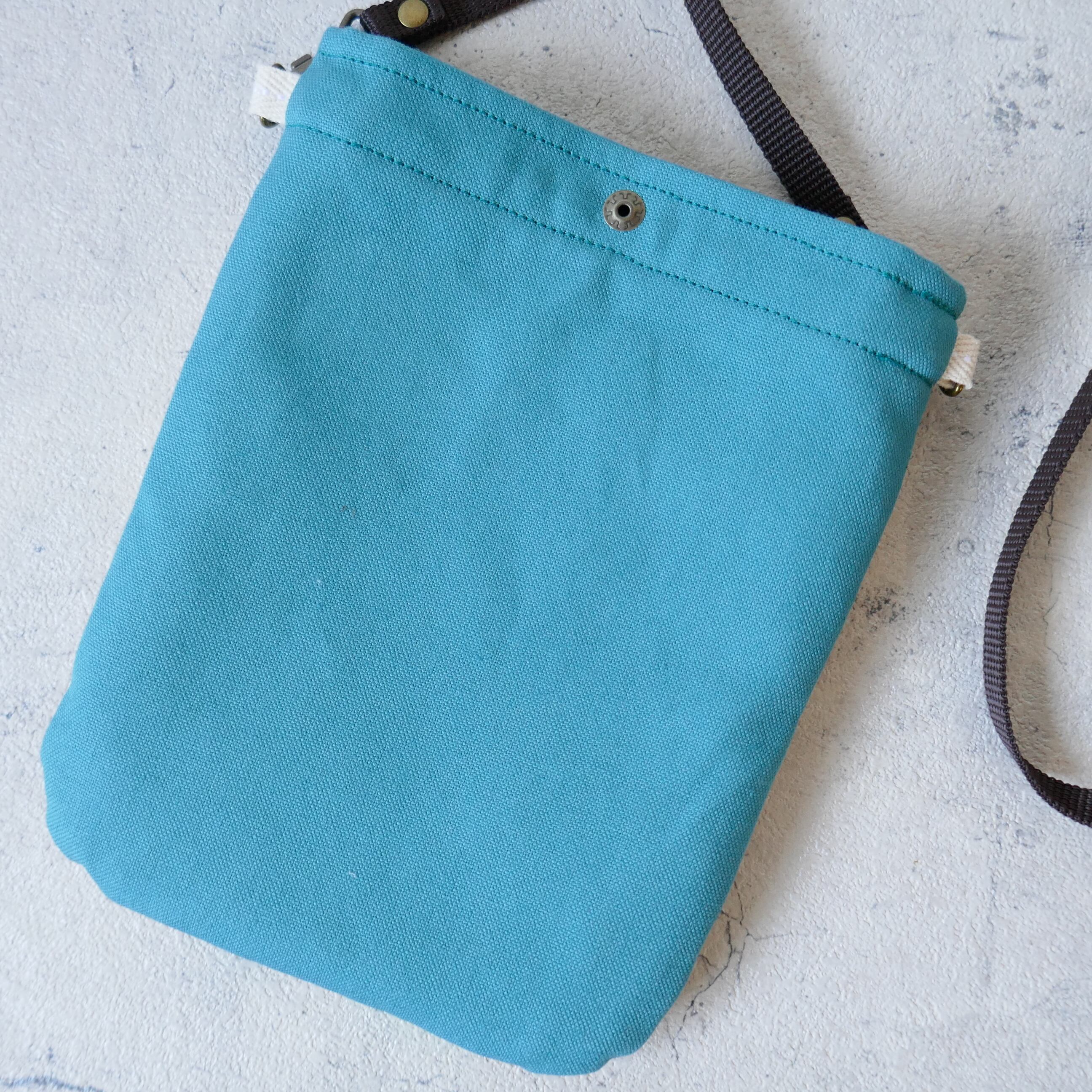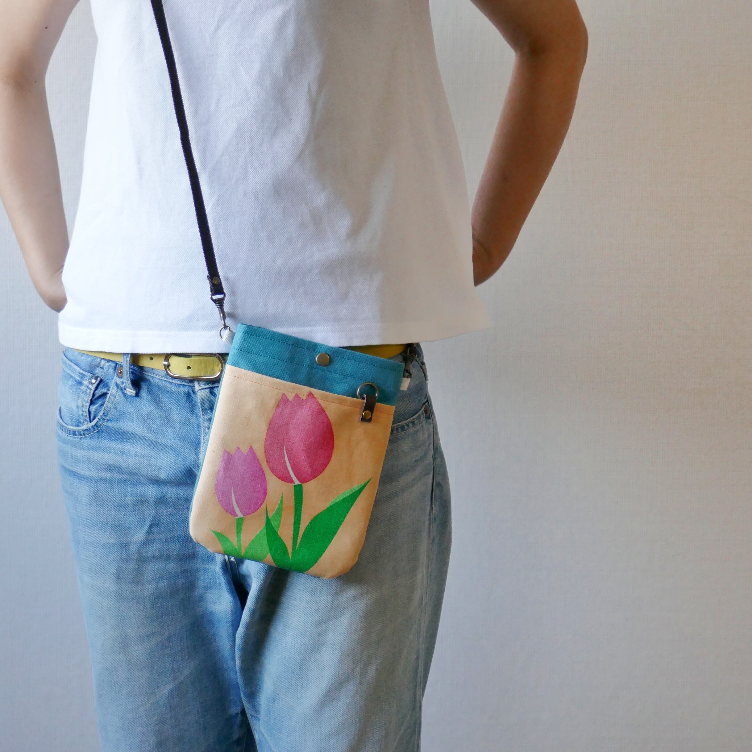 帆布をシルクスクリーンで染めたチューリップ柄のスマホポシェットです。