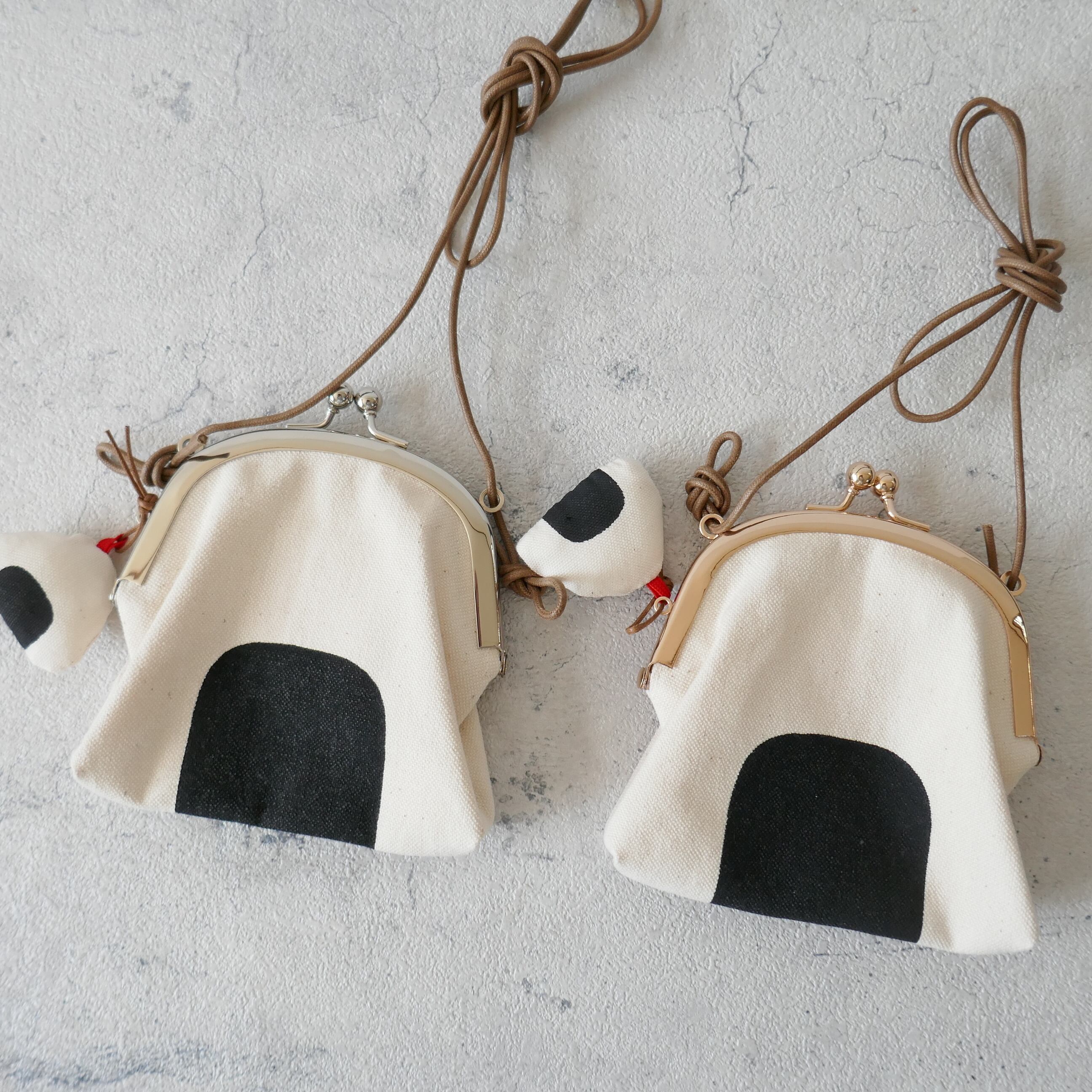 帆布をシルクスクリーンの技法で染めた首から下げるおにぎり型のがまぐちです。