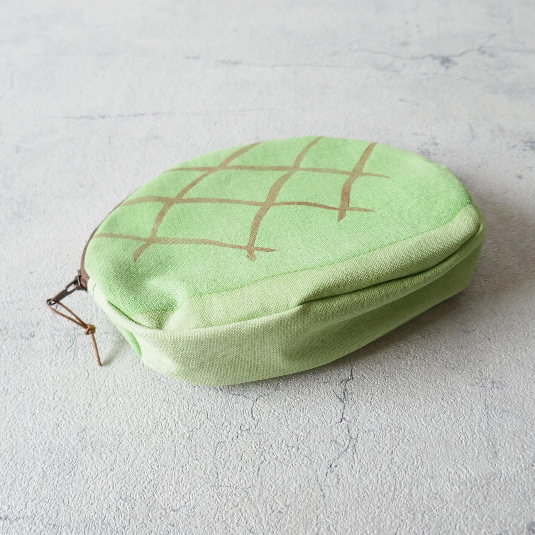 帆布をシルクスクリーンで染めたメロンパン型のポーチです。