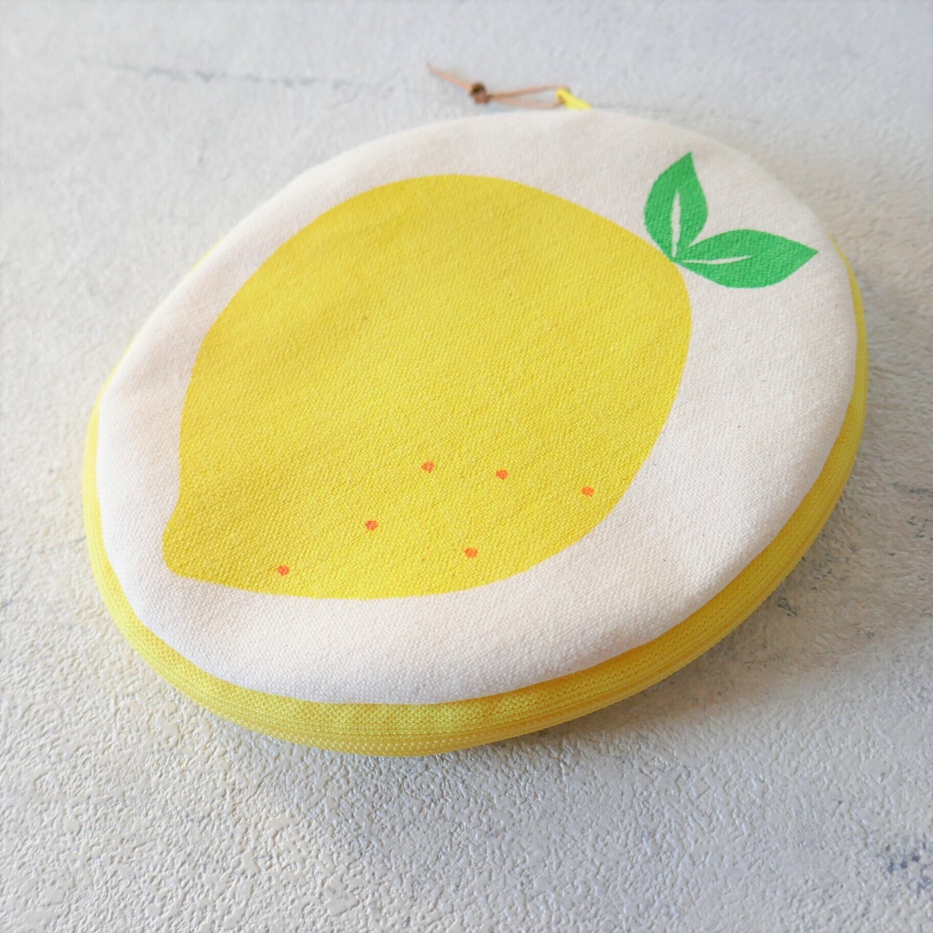 帆布をシルクスクリーンで染めたレモン柄のポーチです。