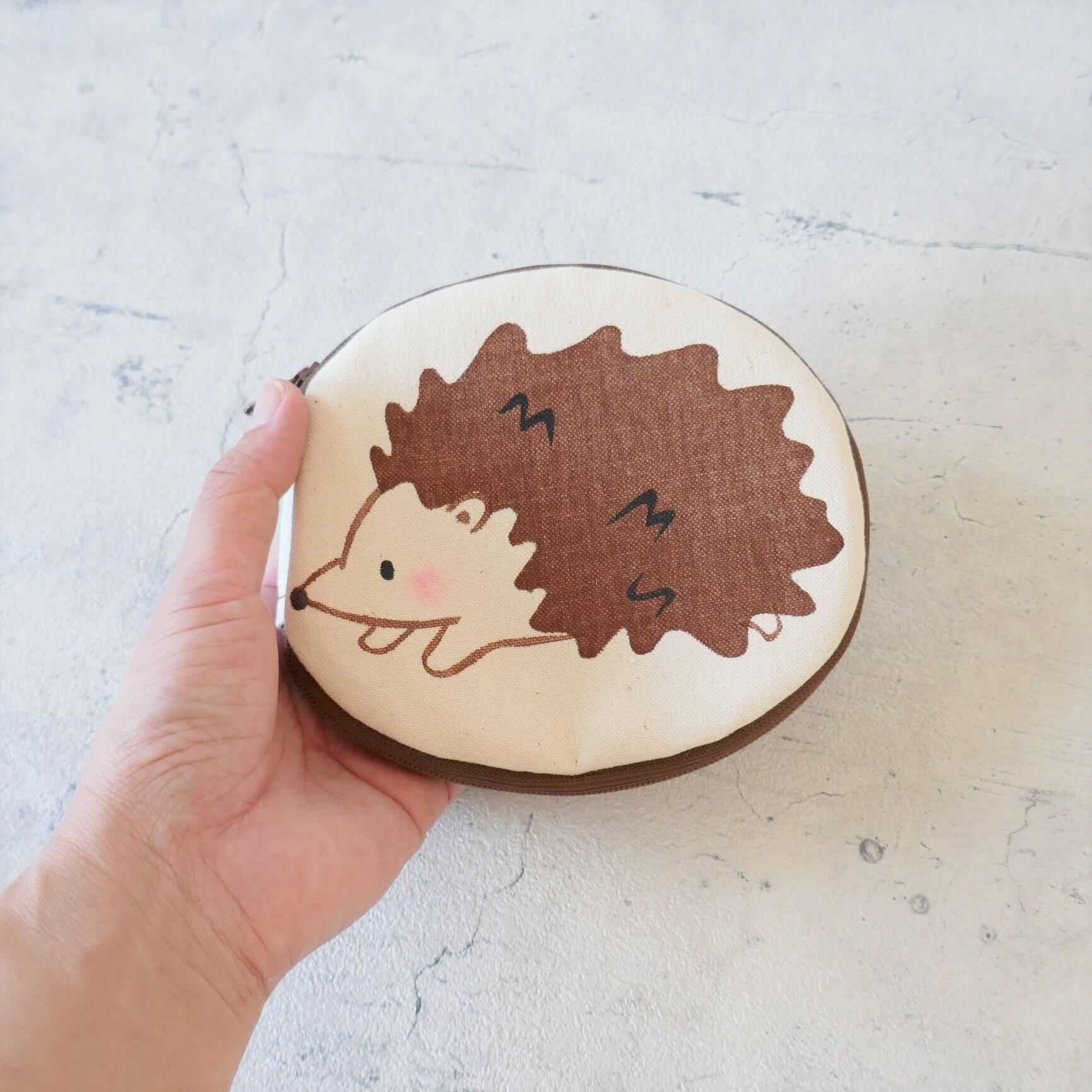 帆布をシルクスクリーンで染めたハリネズミ柄のポーチです。