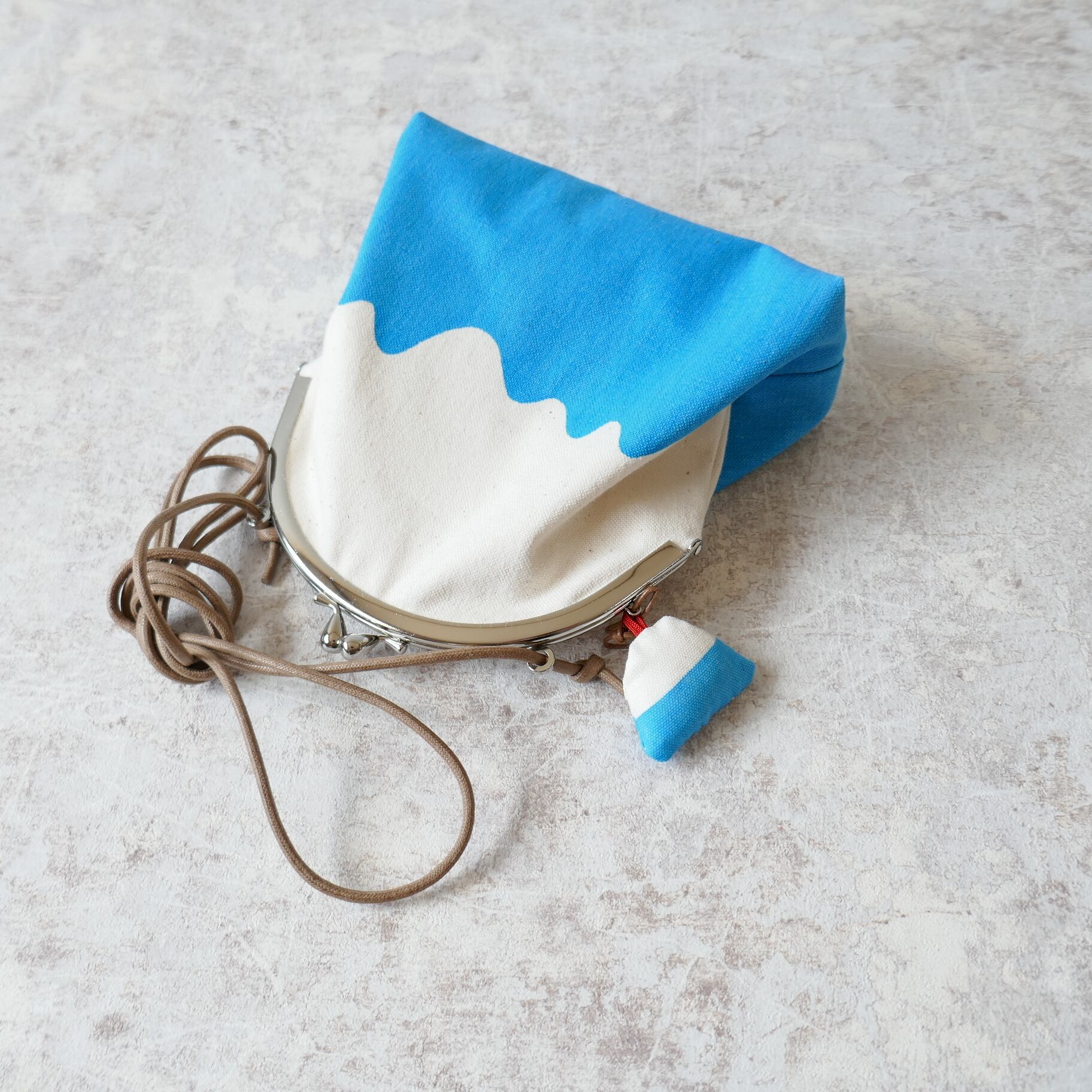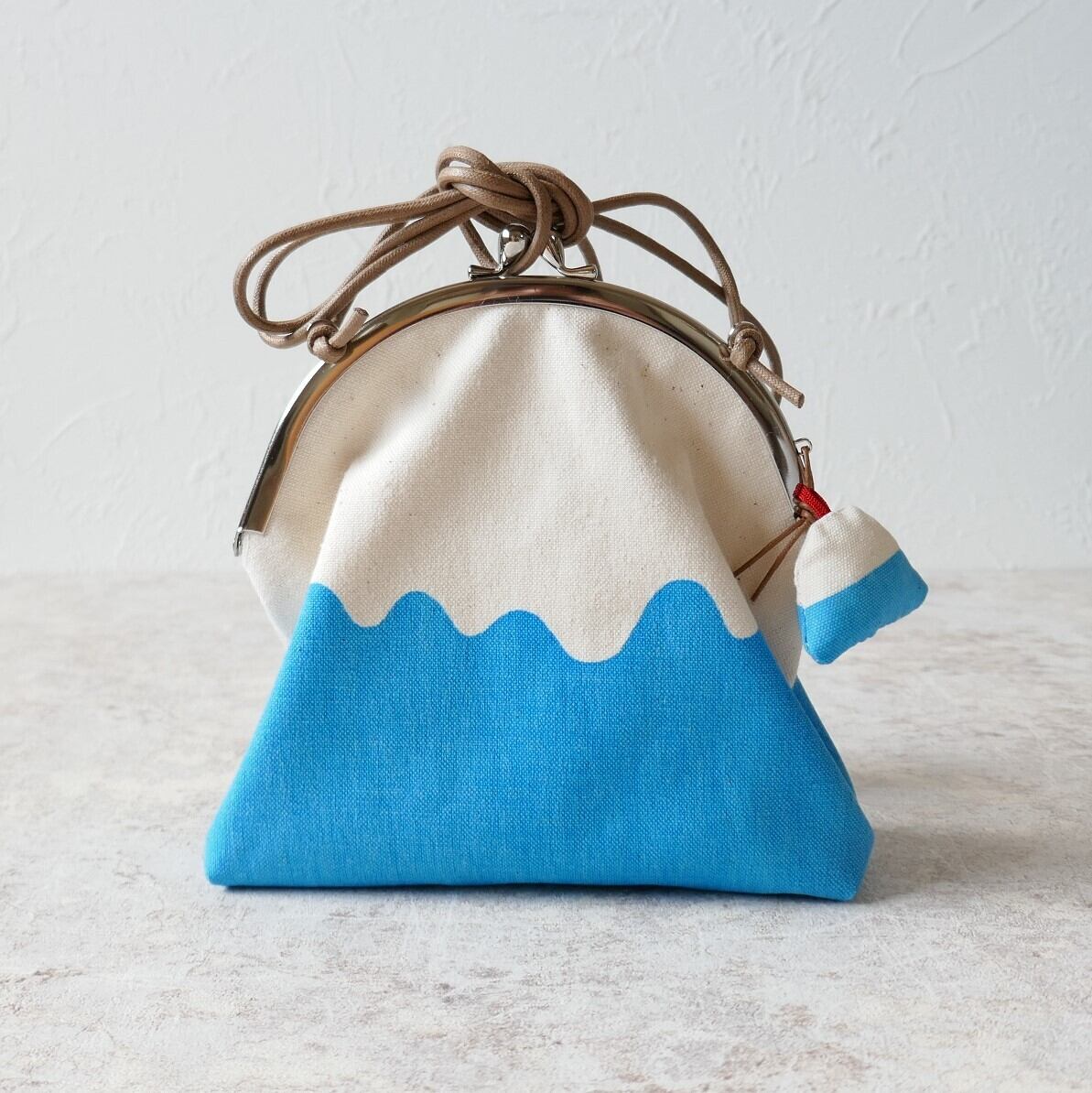 帆布をシルクスクリーンで染めた水色の富士山型のポシェットです。