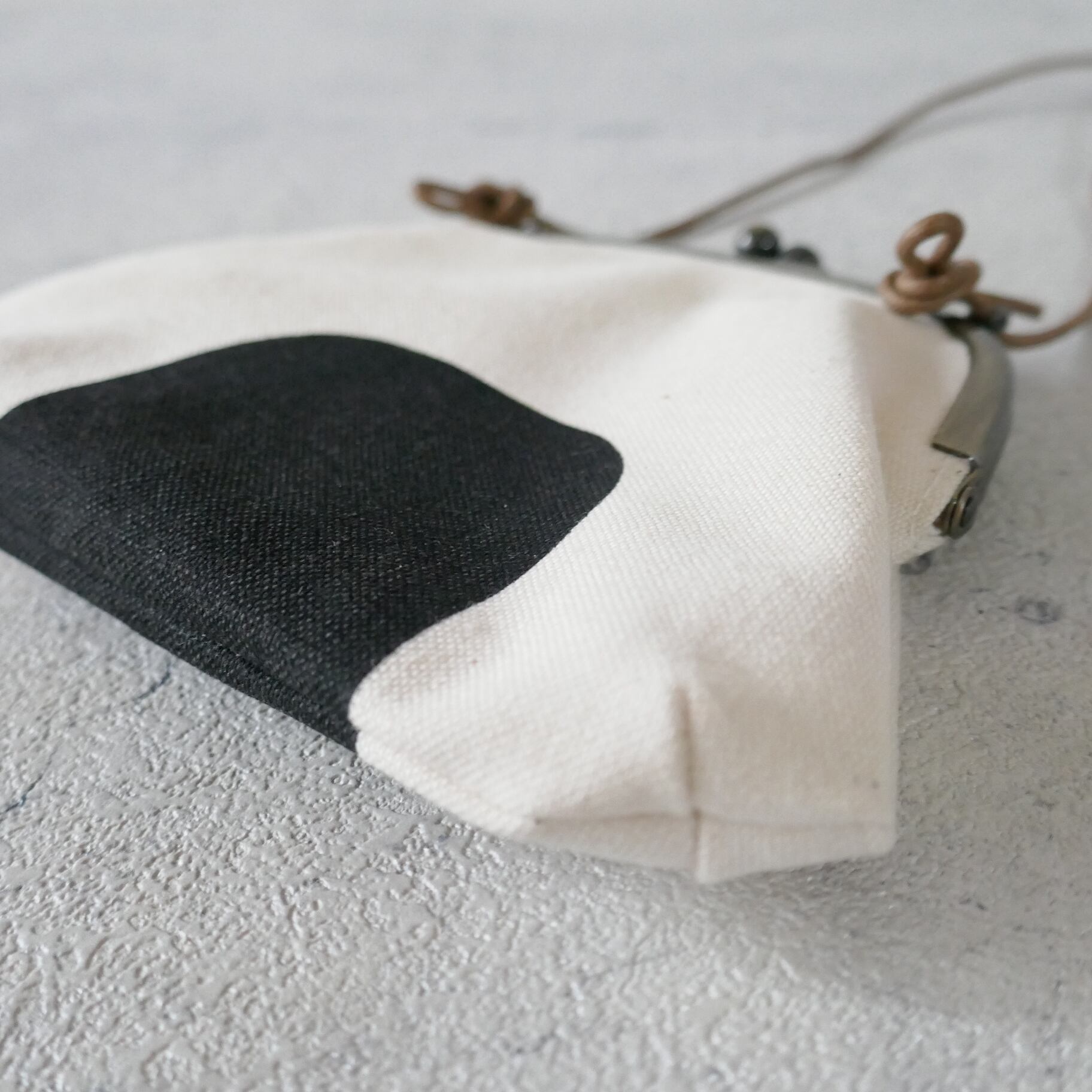 帆布をシルクスクリーンで染めた、首から下げられるおにぎり型のがま口です。
