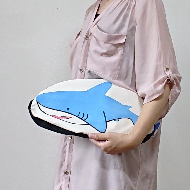 帆布をシルクスクリーンで染めたサメ柄の大きなポーチです。