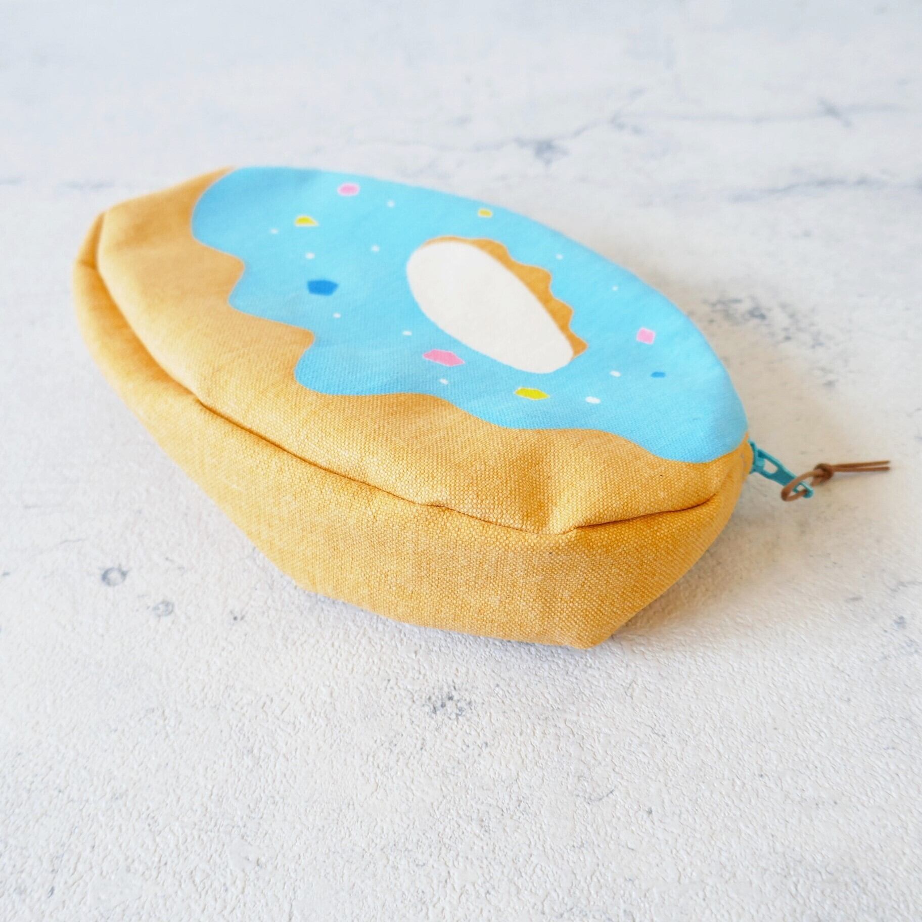 帆布をシルクスクリーンで染めたドーナツ型のポーチです。